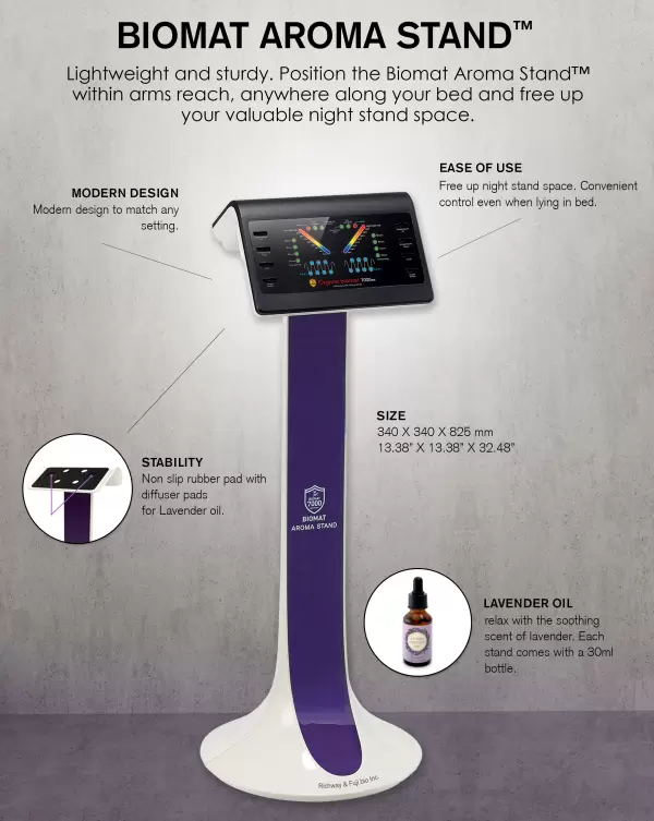 The Biomat Aroma Stand™ provides a convenient holder for your Biomat controller. The soothing scent of lavender will help you fall asleep and wake up feeling refreshed.